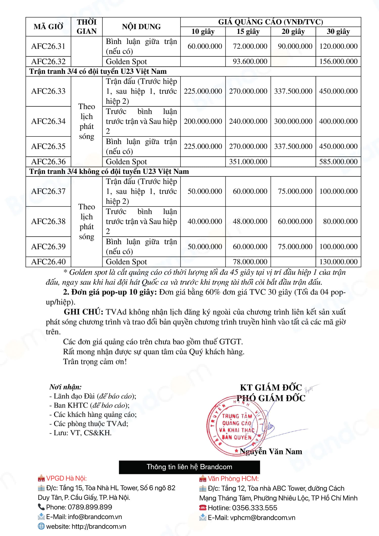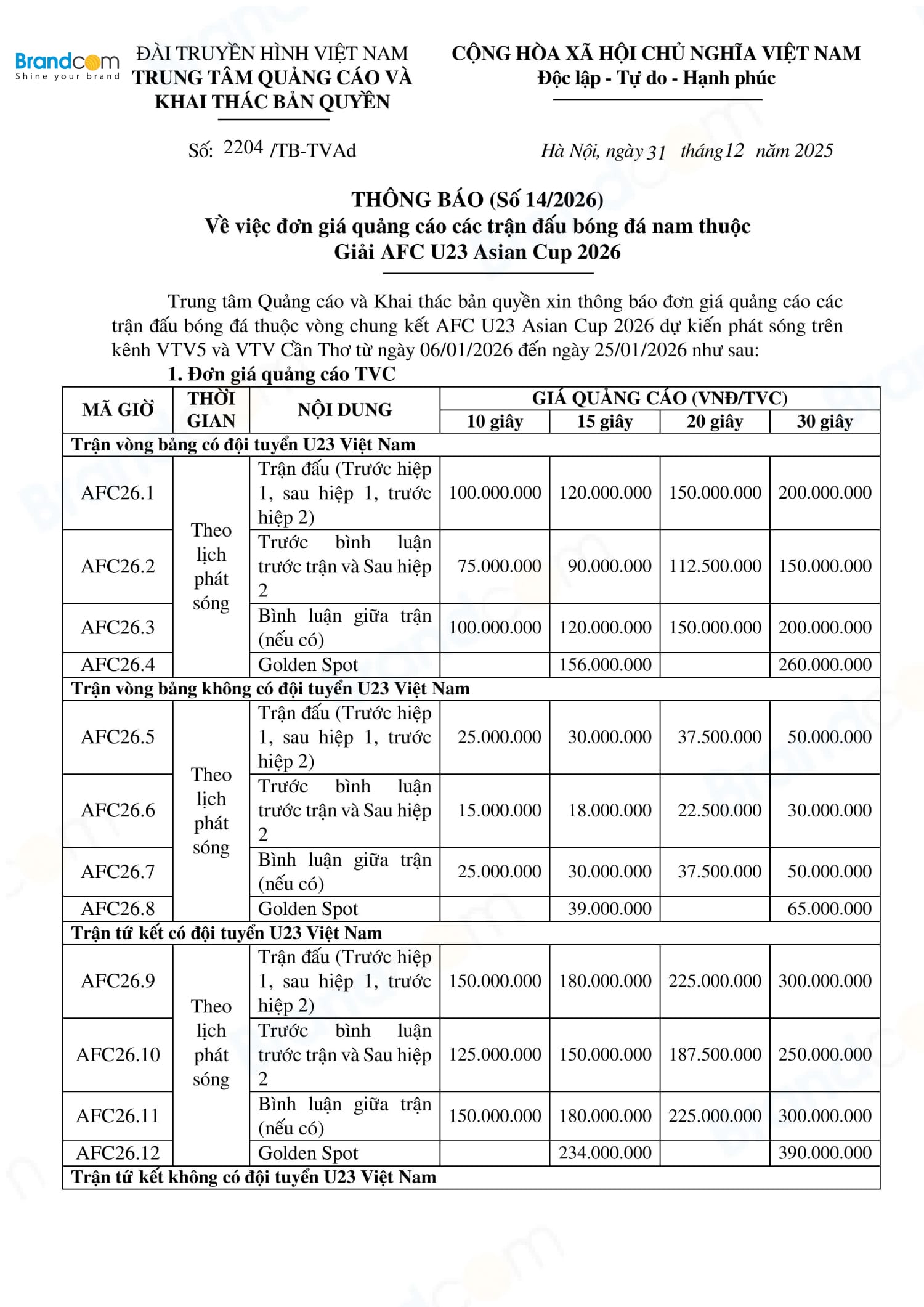 Bảng giá quảng cáo trận tứ kết U23 Việt Nam và các trận đấu bóng đá nam thuộc giải AFC U23 Asian Cup 2026.