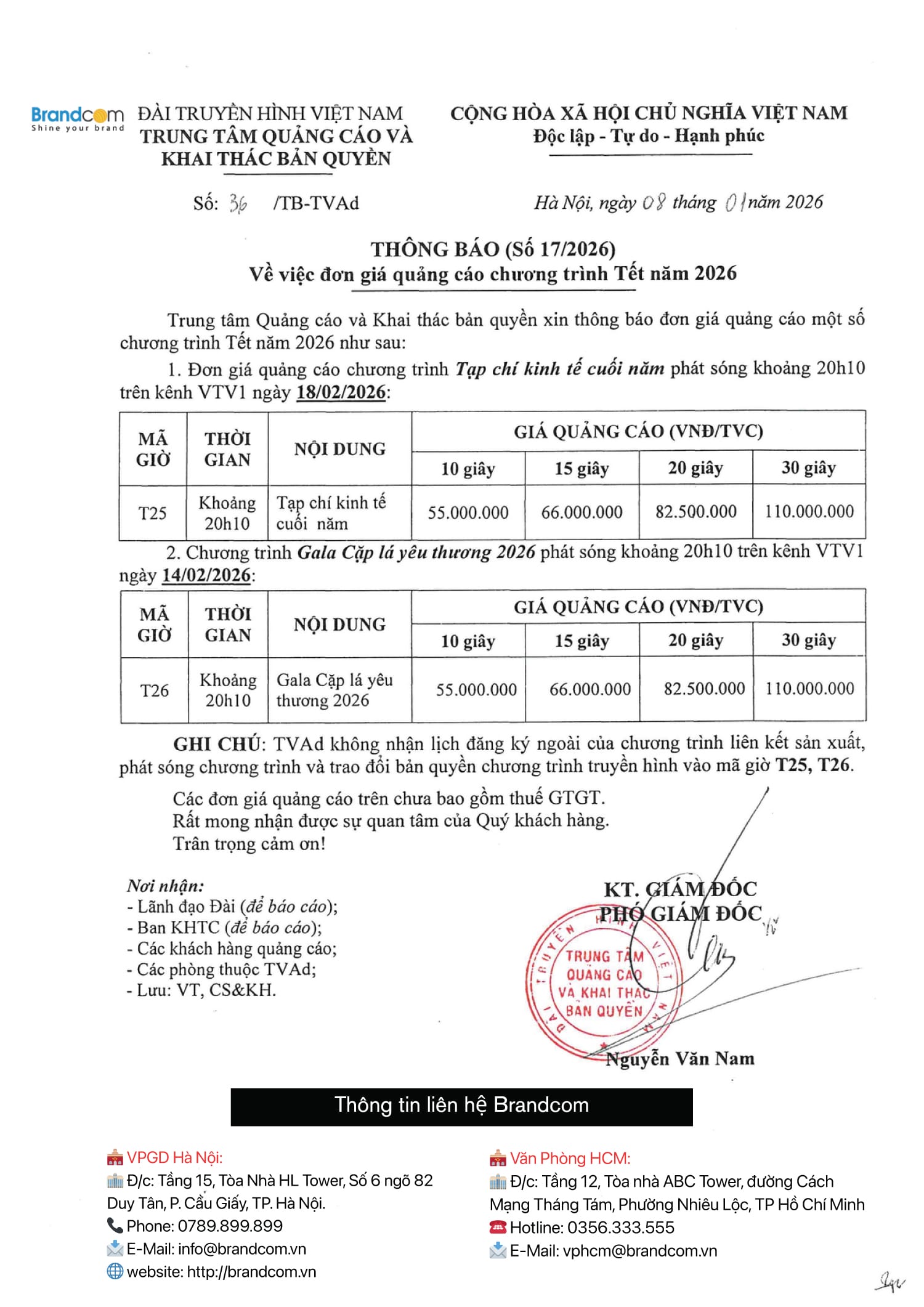 CÔNG TY CP TRUYỀN THÔNG THƯƠNG HIỆU VIỆT NAM – BRANDCOM xin thông báo đơn giá quảng cáo một số chương trình đón Tết 2026 như sau: