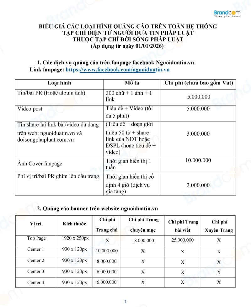 Bảng giá quảng cáo Tạp chí điện tử Người đưa tin pháp luật 2026 mới nhất.
