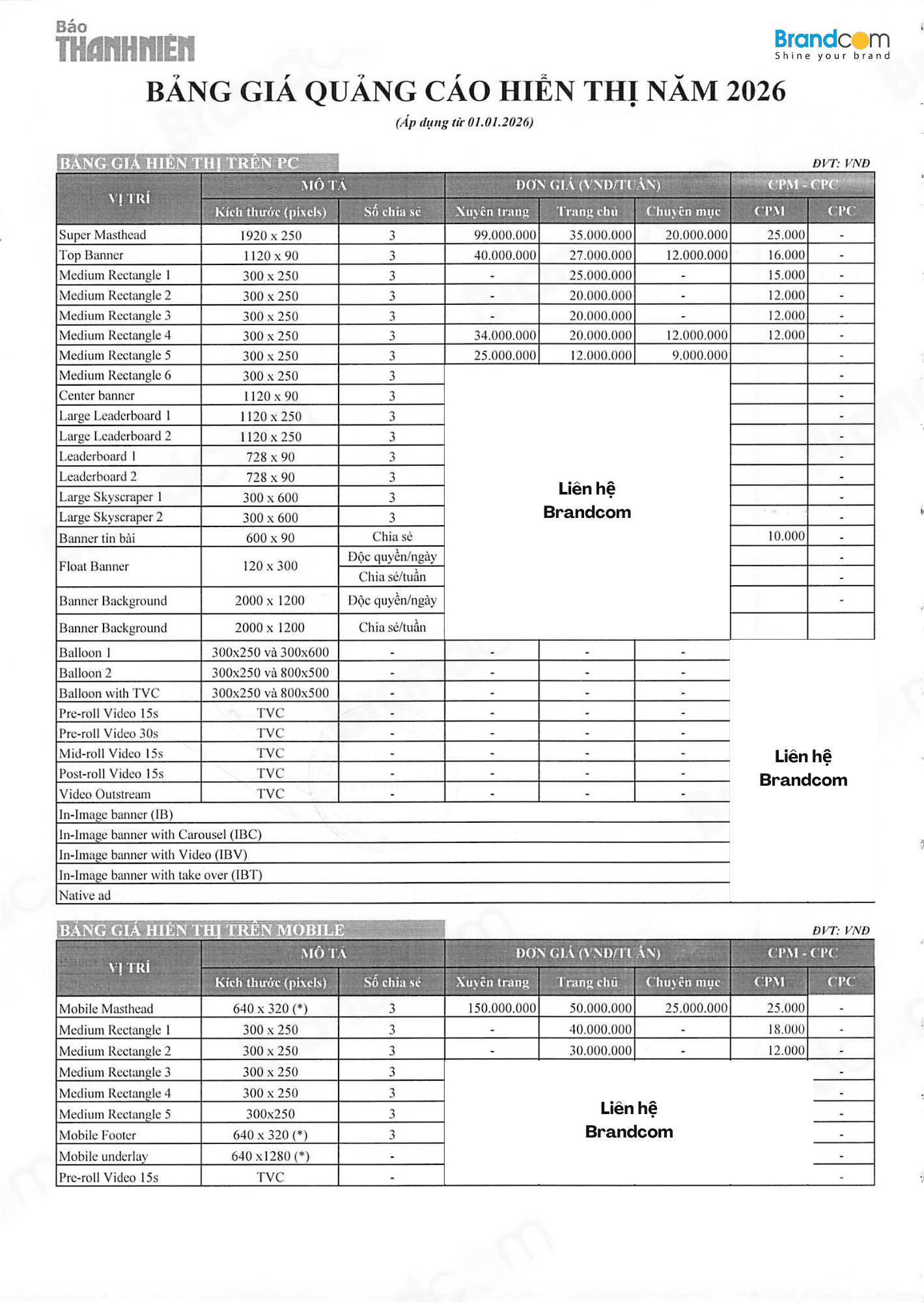 Báo giá quảng cáo banner báo Thanh niên 2026 mới nhất