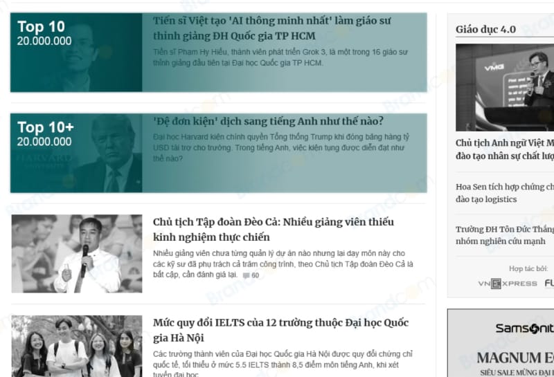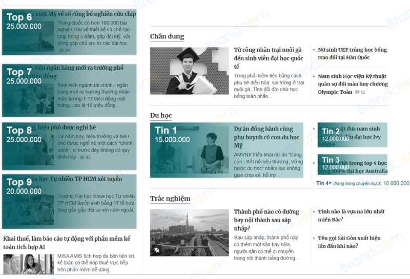 Chuyên mục Giáo dục của báo VnExpress là nơi cập nhật nhanh chóng các thông tin về tuyển sinh, thi cử, chính sách giáo dục và xu hướng học tập trong nước và quốc tế. Nội dung tại đây không chỉ cung cấp tin tức mà còn có các bài phân tích, tư vấn hướng nghiệp, giúp học sinh, sinh viên và phụ huynh có thêm cơ sở để đưa ra lựa chọn phù hợp. Với lượng độc giả ổn định và độ tin cậy cao, chuyên mục này cũng là kênh truyền thông hiệu quả để tiếp cận nhóm đối tượng quan tâm đến giáo dục và đào tạo.