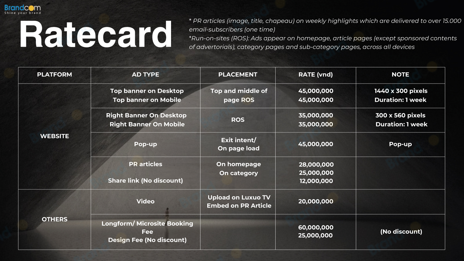 Báo giá quảng cáo trên Luxuo Media Kit 2026 mới nhất. BRANDCOM cung cấp cho quý khách hàng thông tin chi tiết về bảng giá quảng cáo Luxuo.vn năm 2026. Từ đó, bạn có thể lựa chọn hình thức quảng cáo phù hợp với nhu cầu và ngân sách của mình.