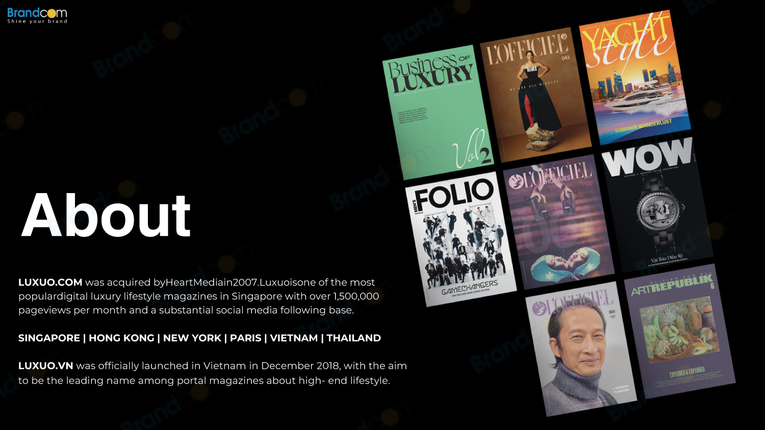 LUXUO.COM được thành lập bởi Heart Media vào năm 2007. Luxuo là một trong những tạp chí kỹ thuật số về lối sống sang trọng phổ biến nhất tại Việt Nam với: