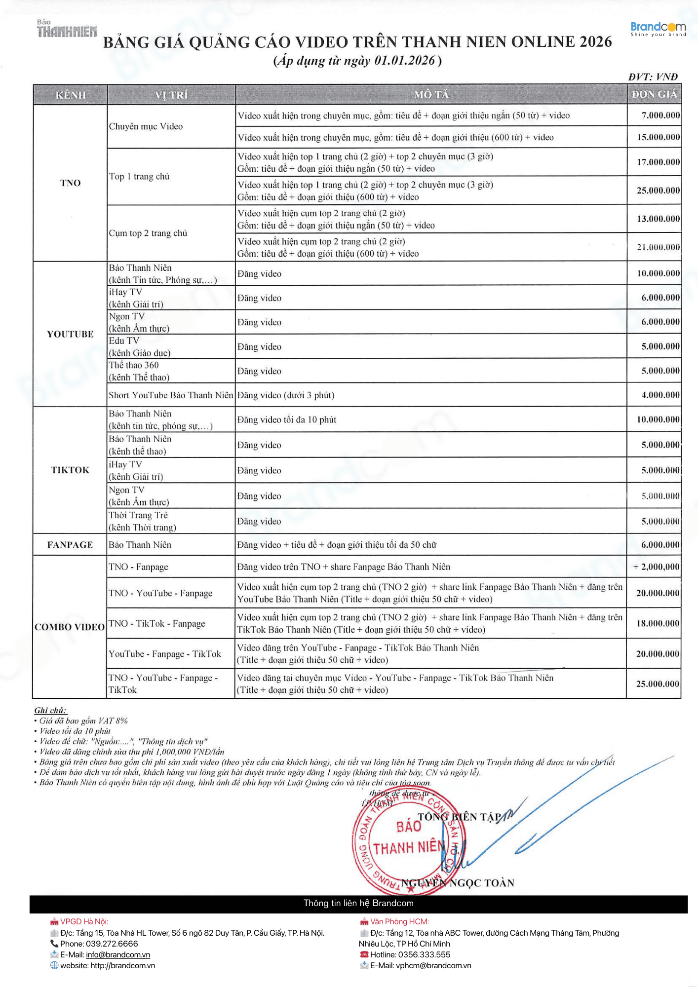 Quý khách có nhu cầu quảng cáo video trên báo Thanh Niên, xin liên hệ ngay với chúng tôi để được tư vấn và nhận được ưu đãi tốt nhất năm 2026
