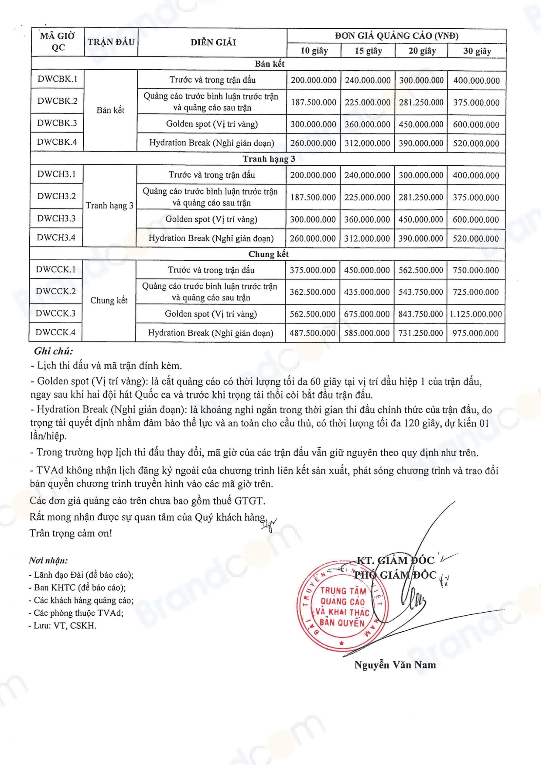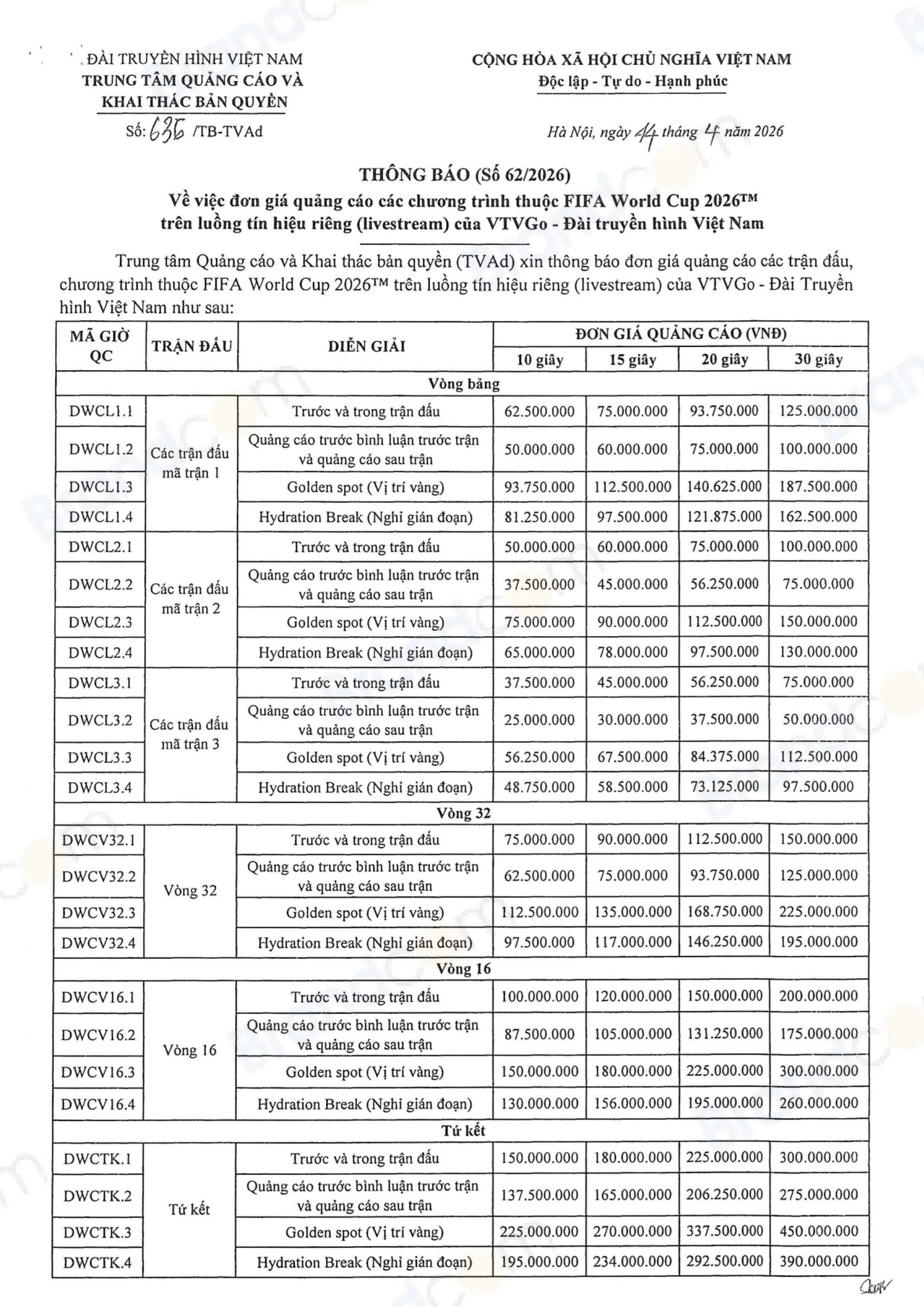 3. Báo giá quảng cáo các chương trình thuộc FIFA World Cup 2026 trên sóng tín hiệu riêng (livestream) của Đài Truyền hình Việt Nam