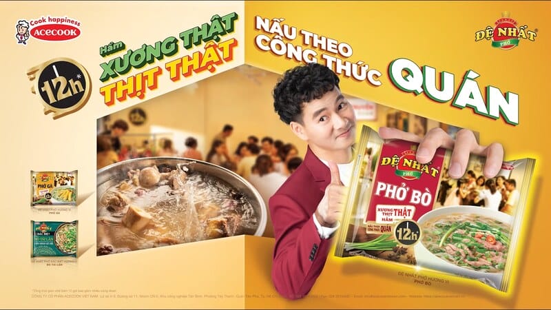 TVC khắc họa quy trình nấu phở công phu với hình ảnh Xuân Bắc dẫn chuyện sinh động, dí dỏm. Quảng cáo truyền hình này nhấn mạnh thông điệp “xương hầm thịt thật trong 12 giờ”, tạo sự tin tưởng về chất lượng sản phẩm. Hình ảnh đời thường, gần gũi giúp TVC được khán giả nhớ lâu và dễ lan truyền trong dịp Tết, khi các gia đình quan tâm đến bữa ăn truyền thống.